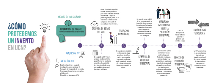 Los académicos o investigadores deberán informar su desarrollo o descubrimiento científico y/o tecnológico, mediante el “Formulario de Declaración de Invención” o “Disclosure”, que contiene campos necesarios para completar información, que permite evaluar distintos criterios referentes a la factibilidad de protección intelectual, ventajas comparativas de la tecnología y su potencial para ser transferida.